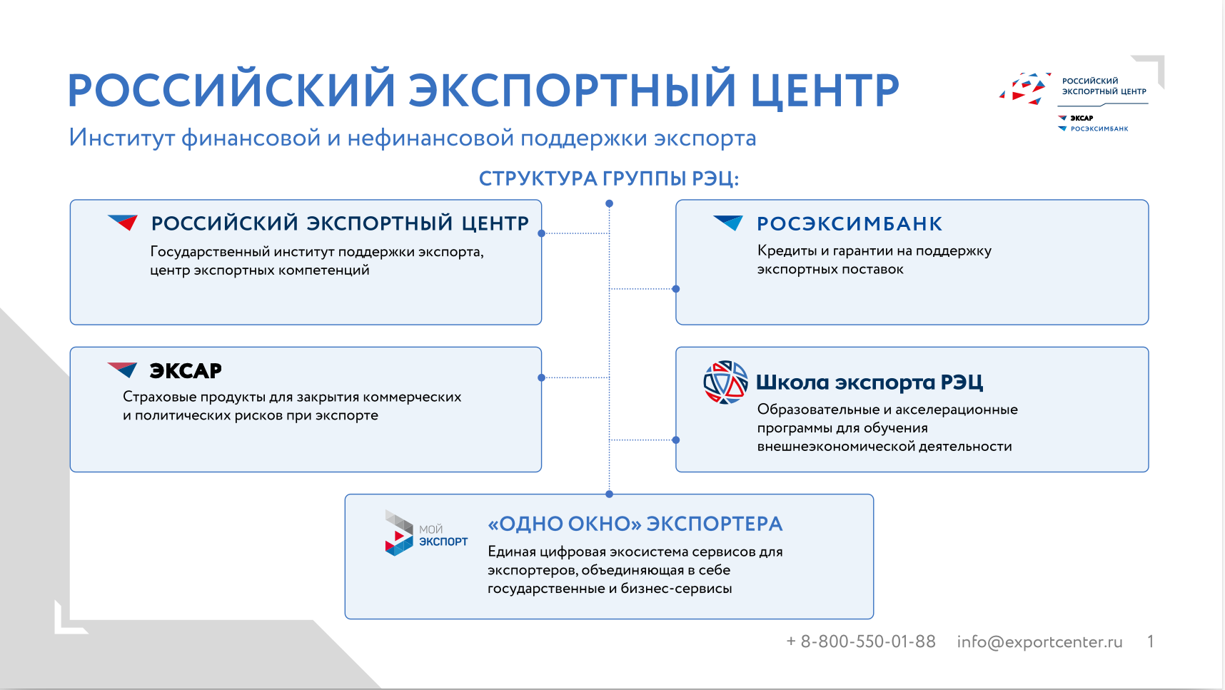 Группа РЭЦ, развиваясь и эволюционируя одновременно с меняющейся ситуацией в мировой экономике, предлагает российским экспортерам финансовые и нефинансовые продукты с учетом их актуальных потребностей, сегментной политики, и исходя из необходимости обеспечения синергетического эффекта от усилий всех институтов развития, включая центры поддержки экспорта в регионах России.